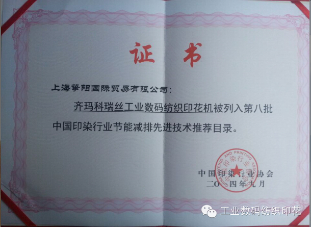 奥地利齐玛科瑞丝工业数码纺织印花机被列入第八批中国印染行业节能减排先进技术推举目录!